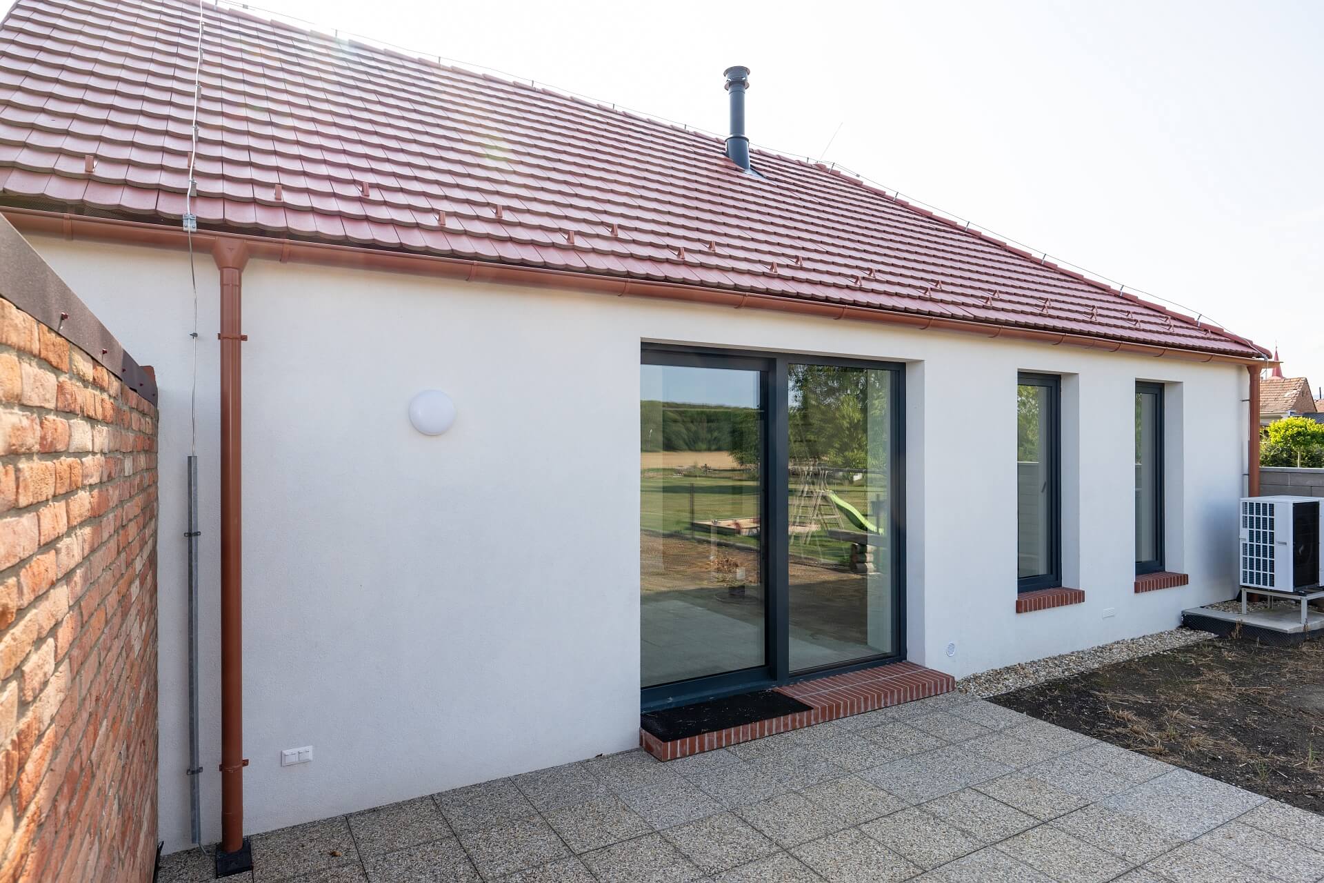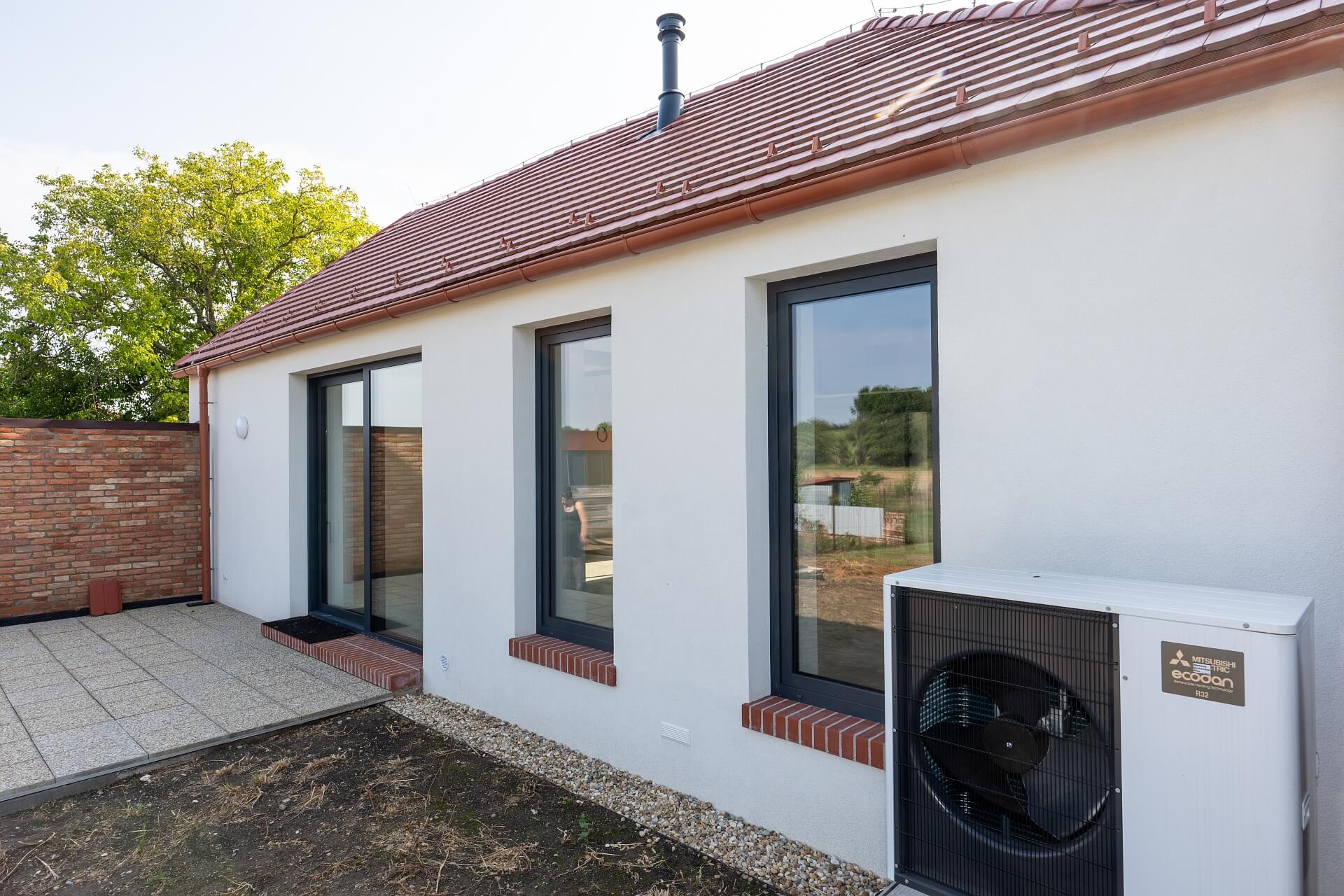tepelného čerpadla s 200l zásobníkom vody ktorá prúdi do slučiek podlahového vykurovania je regulovaná v závislosti na vonkajšej teplote. Vonkajšia jednotka Power inverter – PUD-SWM80YA je umiestnená za domom a celý systém pracuje ako schéma vzduch – voda. V miestnosti kúpeľne je osadený doplnkový rúrkový radiátor.