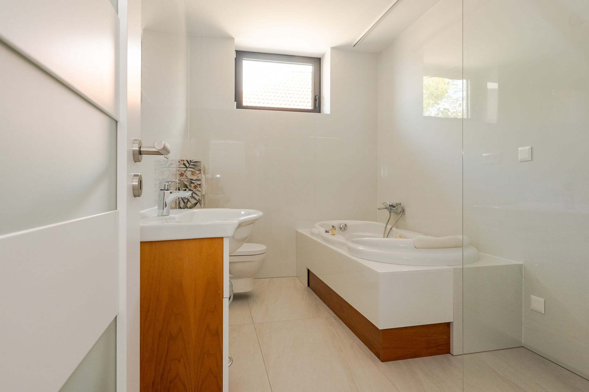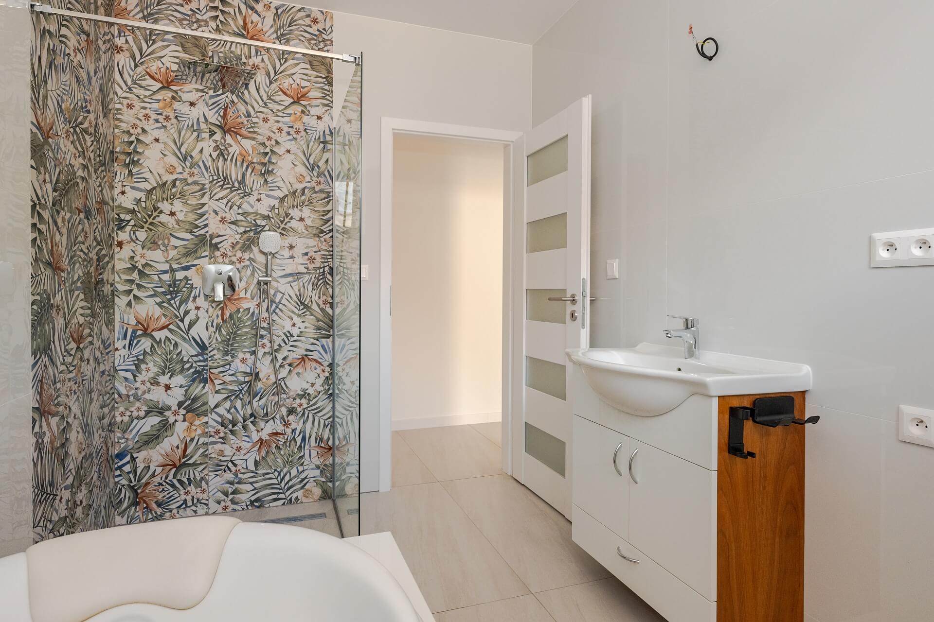 Sprchový kút má zrealizovaný podlahový žľab ako i sklenú zástenu. V kúpeľni je osadená vírivá, masážna vaňa. Okrem WC v kúpeľni s hygienickou sprškou, je v dome ešte jedno WC zriadené v samostatnej miestnosti s umývadlom, jednoducho komunikačne prístupné z dennej časti. Centrálna stena v kuchyni je obložená bielim lesklým štýlovým obkladom.