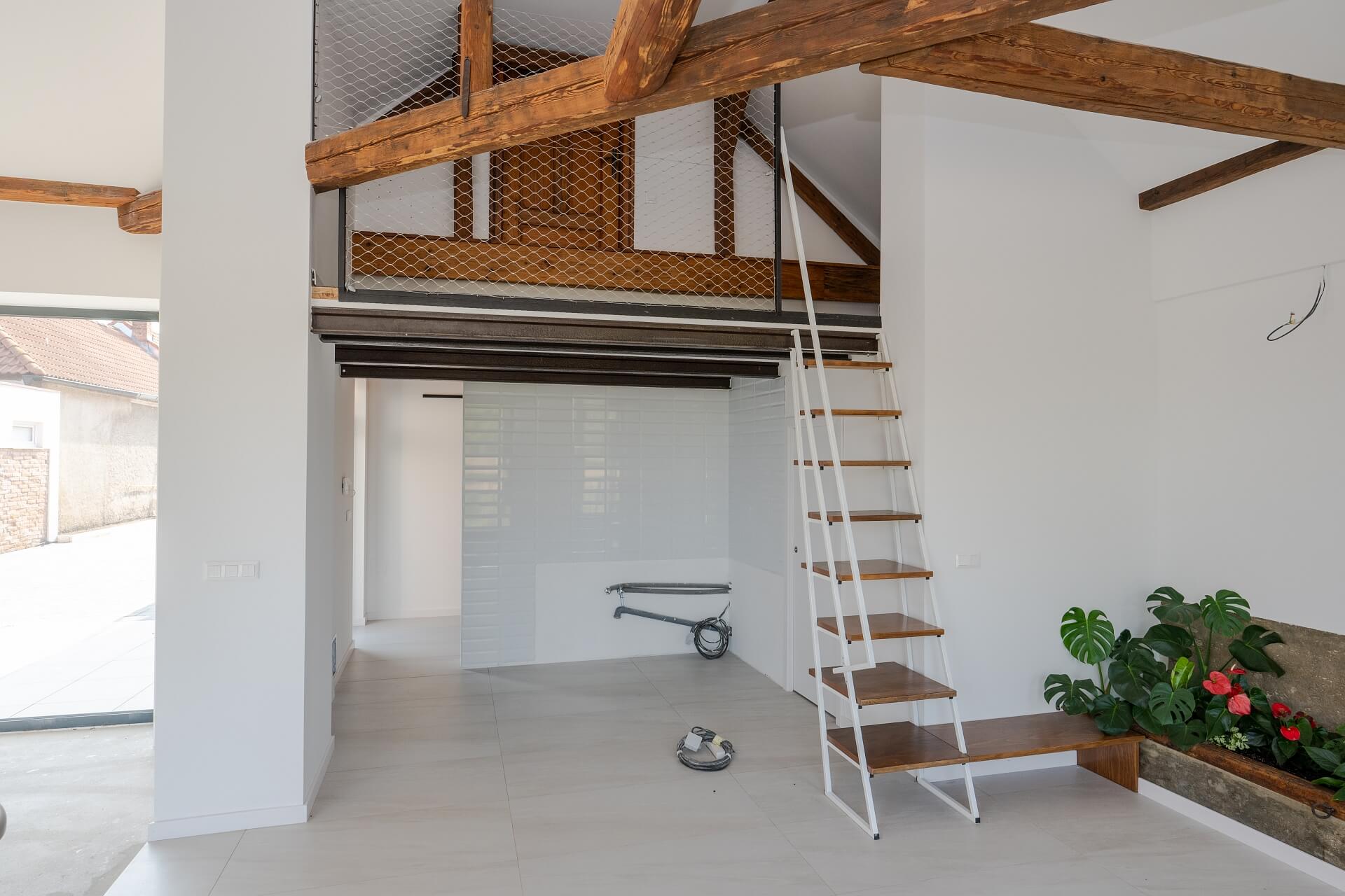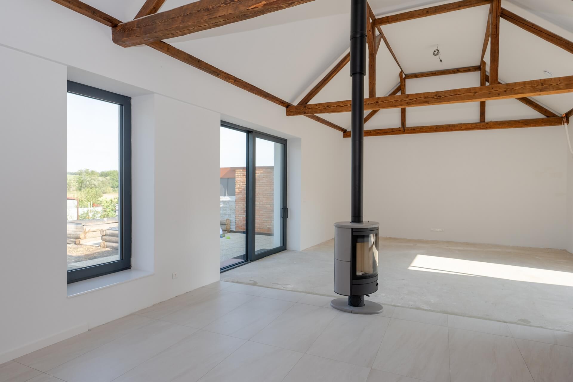 Z hľadiska konštrukčného je dom bezbarierový, jednopodlažný, bez obytného podkrovia s galériou pre pracovňu a podkrovným priestorom pre všetky technologické prvky domu. RD má výhradne obytnú funkciu. V časti pre jedáleň je zhotovený kvetináč vysadený izbovými kvetmi. V strede obývacieho priestoru je osadený otočný krb, ktorého vizuálne efekty môžu byť vnímané zo všetkých denných častí domu, podľa toho, kde práve trávite čas. Pre výstup na galériu sú zrealizované schody mlynárskeho typu , zároveň slúžiace ako poličky kuchyne. Pre výstup na terasu sú použité veľké hliníkové posuvné dvere s bezbarierovým prechodom posuvno-zdvižným systémom. Celý interiér je zhotovený s SDK dosák a dreva v kombinácii s oceľou čo vytvára príjemnú pohodu a ucelený vzhľad.